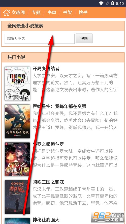在安装女趣阁小说的最新版本v2后,首页上方会出现一个搜索区域栏目。