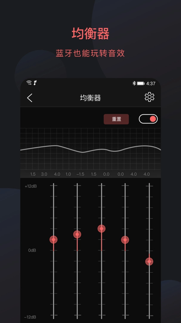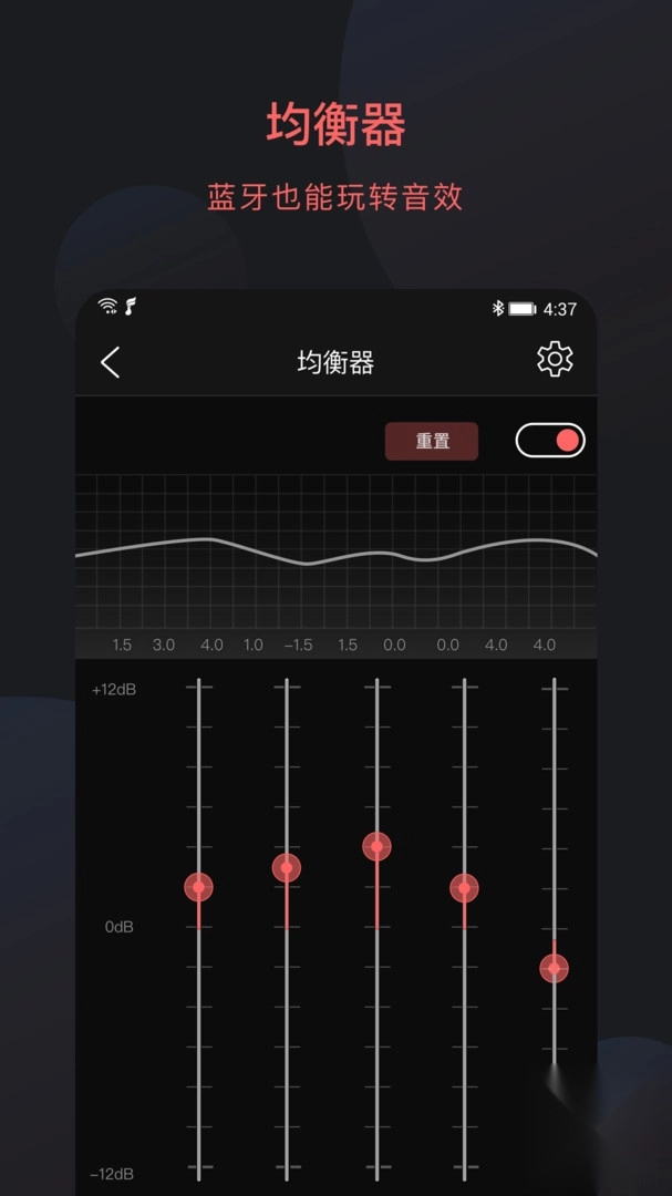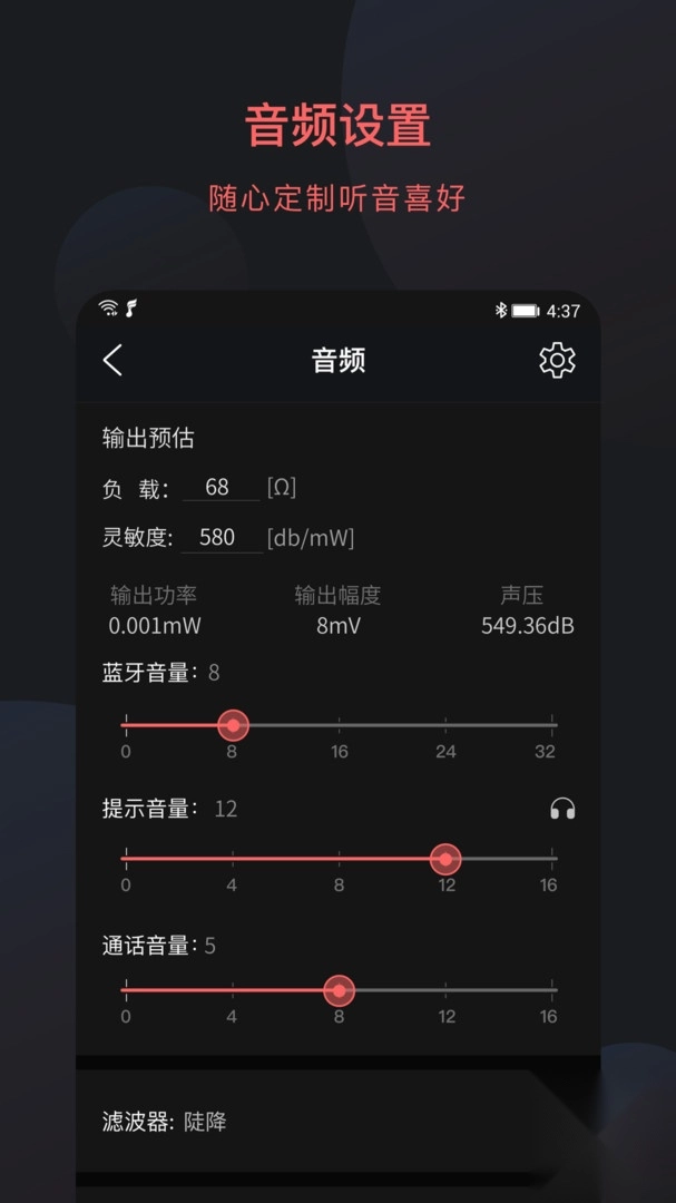 3、应用强大的音频设置功能,用户可以对蓝牙设备进行均衡器调节,以及滤波器、声道平衡等相关音频设置,从而获得更加优质的音频效果。