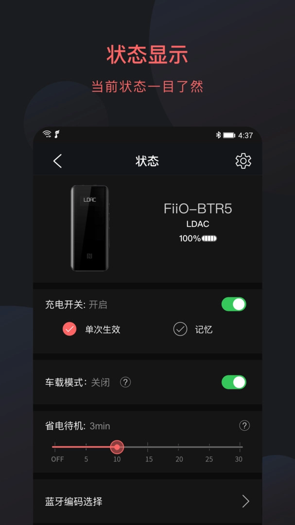 除了音频设置外,fiio control 还支持对蓝牙设备的常规功能进行定制,如充电开关、RGB灯开关、车载模式、DAC工作模式等。