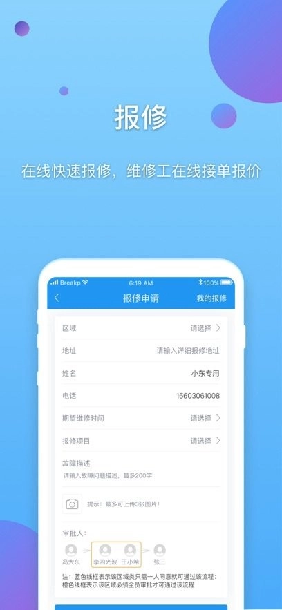 【报修管理】支持在线一键提交报修申请并完成审批流程,能按区域进行点对点精准申报;维修所需材料及相关费用可在线获取报价,维修费用支持在线支付;同时提供维修服务质量评价与反馈渠道。