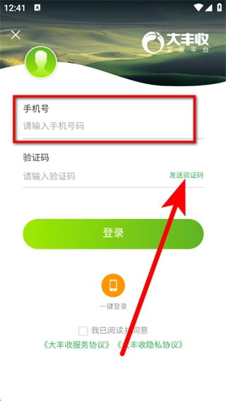 3、在登录界面,输入手机号码,点击发送验证码。