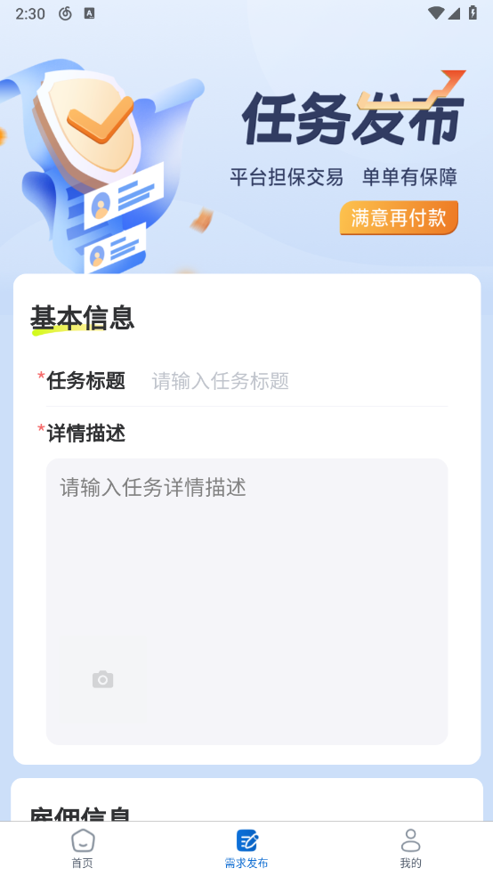 3、点击“需求发布”,用户可以通过添加任务标题以及详情描述等内容,点击“立即发布',等待相关人员进行接单。