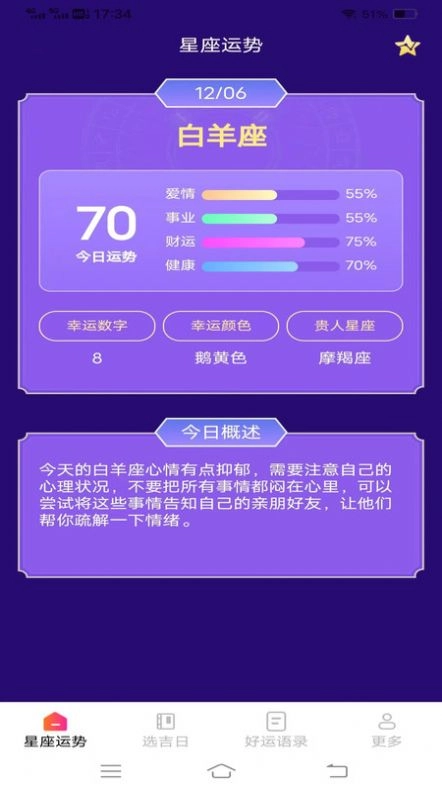 已全面涵盖感情、事业、财运、健康、学业等各领域的运势解析,为用户带来全方位的星座运势预测及建议。