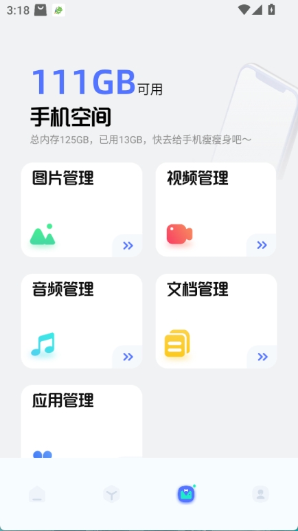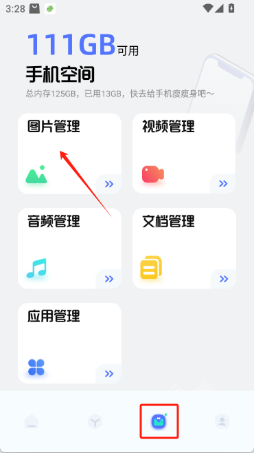 2. 点击第三个图标(即手机空间板块),然后点击图片管理
