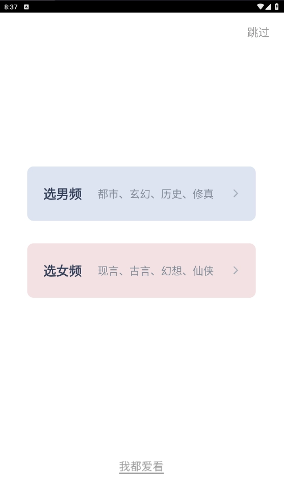 打开软件后,可选择男频或女频,也能选择“我都爱看”选项,或者直接跳过这一步。