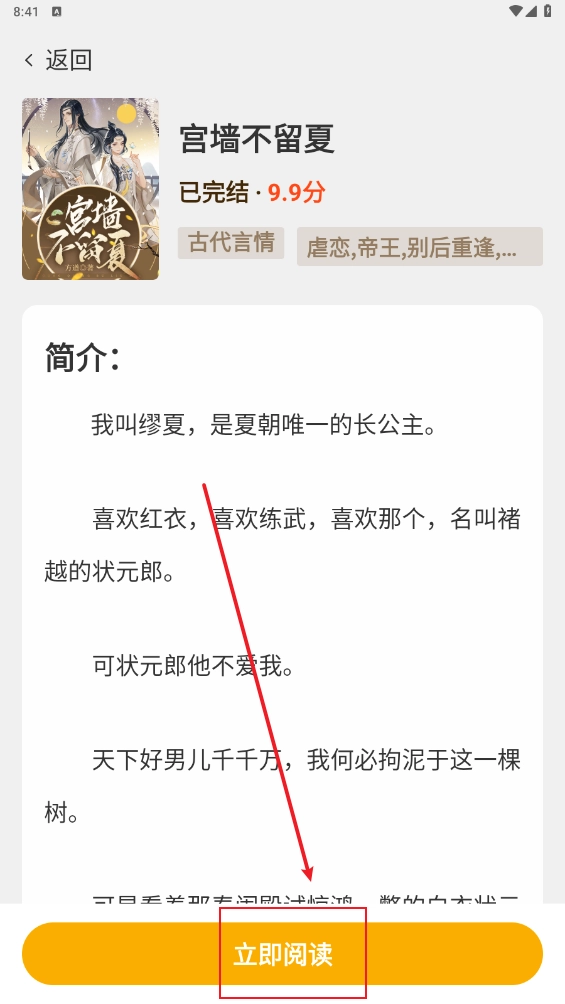 滑动屏幕找到你心仪的小说资源并打开,然后点击“立即阅读”按钮。