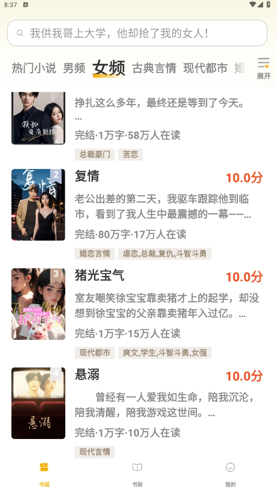 在“书城”板块,收录了热门小说、古典言情、现代都市等各类小说资源。