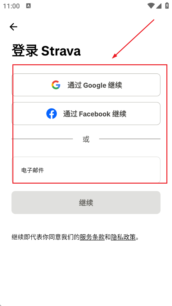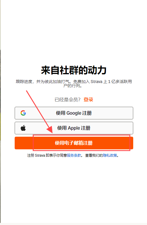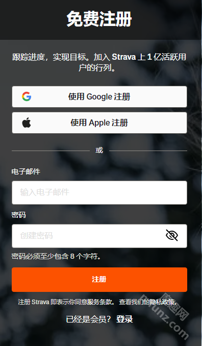 1、打开strava骑行软件进入注册界面,推荐使用邮箱注册账号