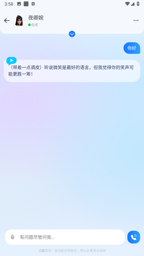 4、在对话框里输入文字,或是直接拨打语音电话,AI都会第一时间给出回复,整个过程就像和朋友聊天般自然。