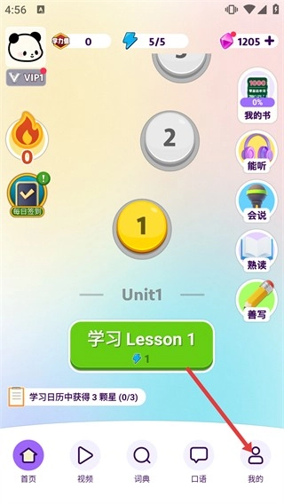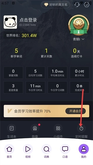1、打开学习类App后,在首页点击底部的【我的】按钮,就能进入个人页面,在该页面可以查看【新学单词】、【累计天数】等各类学习数据的统计信息。
