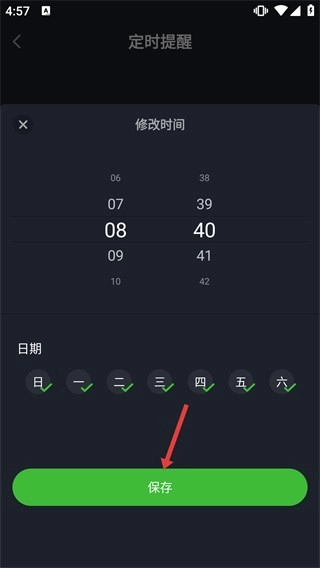 4、进入【修改时间】界面后,先设置好提醒的具体时刻以及重复的日期,接着点击界面底部的【保存】按钮,这样就完成了定时提醒的配置操作。