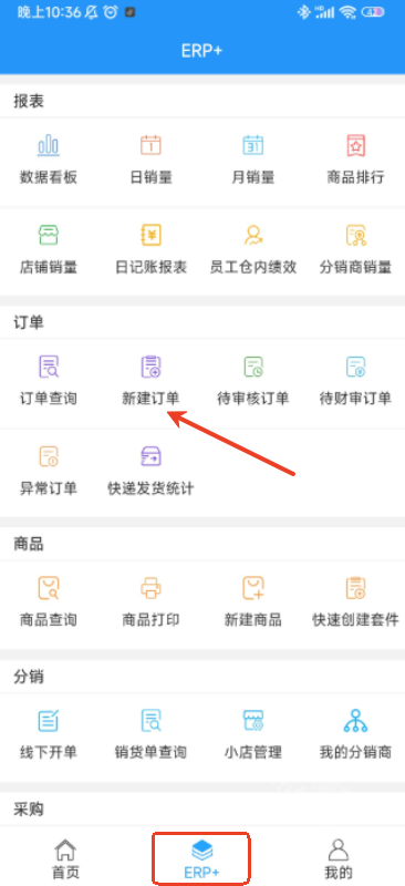 2、登录成功后进入「ERP+」模块,点击新建订单。