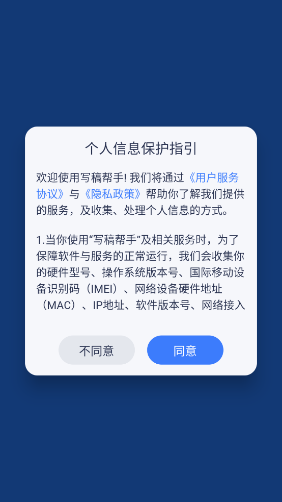 1、打开写稿帮手软件,同意相关的政策与协议。