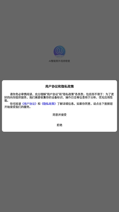 用户协议与隐私政策提示:请您务必仔细阅读并完全理解“用户协议”和“隐私政策”中的各项条款,具体涵盖但不限于以下内容:为了更优质地为您提供服务,我们需要收集您的设备标识、操作日志等信息,这些信息将用于分析和优化应用性能;您可以通过阅读《用户协议》和《隐私政策》来了解详细情况。若您同意相关条款,请点击下方按钮以开始接受我们的服务。按钮选项:同意并接受;拒绝。请点击“同意并接受”按钮。