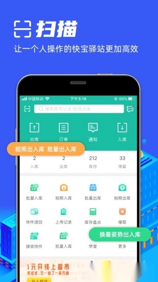 1.快件极速出入库操作:快过把枪的出入库操作,自动识别条形码以及收件人信息,快速入库结束时效考核。支持客户自助微信、操作出库,预约取件实现高峰错峰取件;