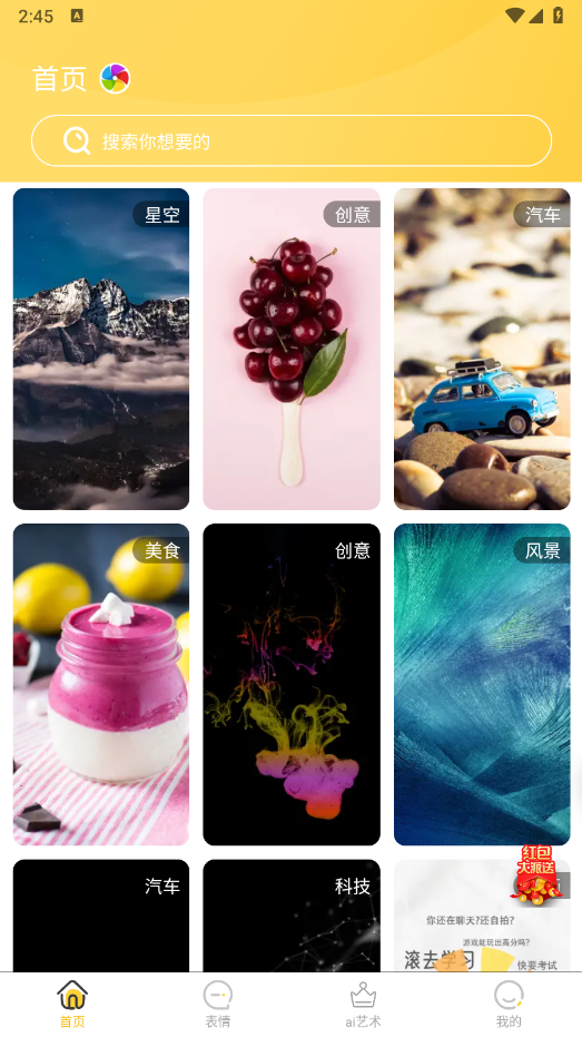 2、进入首页,提供了超级多的壁纸以及表情包资源,包括风景、美食以及汽车等。