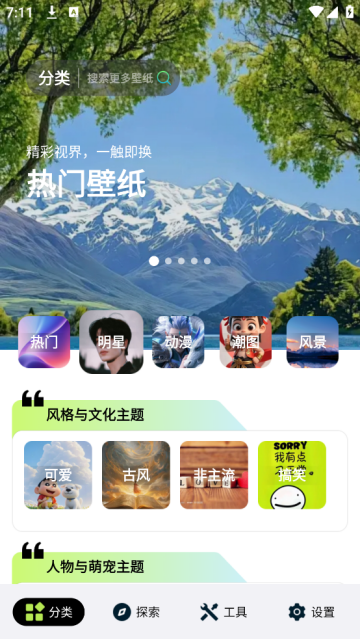 炫彩多多壁纸是一款专注于手机美化的壁纸应用。平台汇聚了众多艺人的高清写真图集,覆盖从经典动漫角色到当下热门新番场景的动漫主题壁纸;热门游戏的角色形象与游戏场景壁纸也应有尽有。此外,还提供风景、简约、复古、潮酷等多元风格的壁纸资源,各类风格的壁纸都能在这里轻松找到。