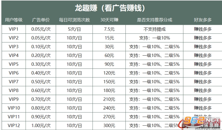 注册就能直接获得VIP1权益,通过观看更多广告可以提升VIP等级,邀请好友数量越多也能助力VIP等级提升;VIP等级越高,浏览广告时匹配到的广告厂商品质越优,广告单价自然也会更高。