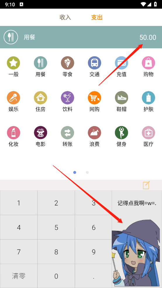 3、在记账页面能够记录收支情况,无论是收入还是支出都要选择不同的类别并输入数字,输入记账金额后,点击右下方的动漫人物就能完成汇总。