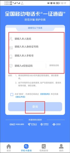1. 查询信息时,用户可输入本人身份信息,随后一键查询名下电话卡的相关信息。