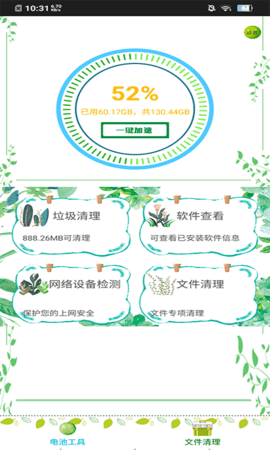 1. 打开软件后,首先会呈现当前手机的内存占用情况以及一些基础信息。用户能够点击屏幕下方的按钮,进入对应的功能界面。