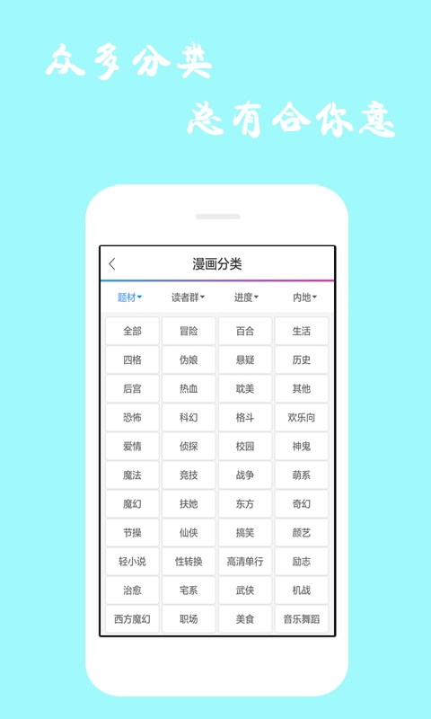 国漫、日漫、美漫,还有连载漫画、完结漫画,以及热血漫画、暗黑漫画,连人气改编作品也都一并搜罗齐全。