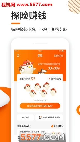 这款应用的玩法和闪电鸡类似,每隔固定时间段点击后会自动派出探险鸡去探索,之后可以收取鸡蛋,将鸡蛋卖掉就能兑换成芝麻,当芝麻累积到1元时,就可以提现到微信账户了。
