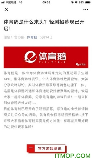 体育鹅是腾讯推出的体育类服务,用户借助它能便捷获取体育赛事、体育游戏等相关资讯。在此,IT猫扑小编提供相关指引,大家可在公众号中搜索“体育鹅”来获取内测资格。欢迎感兴趣的用户前往IT猫扑应用体验!
