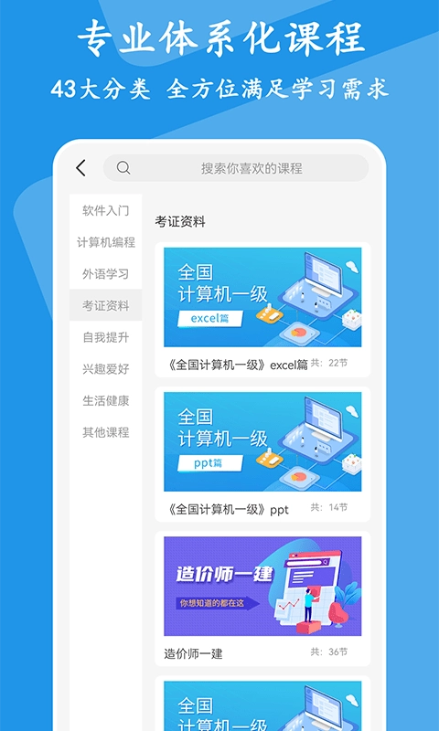 专业系统课程,43大类全方位满足学习需求。
