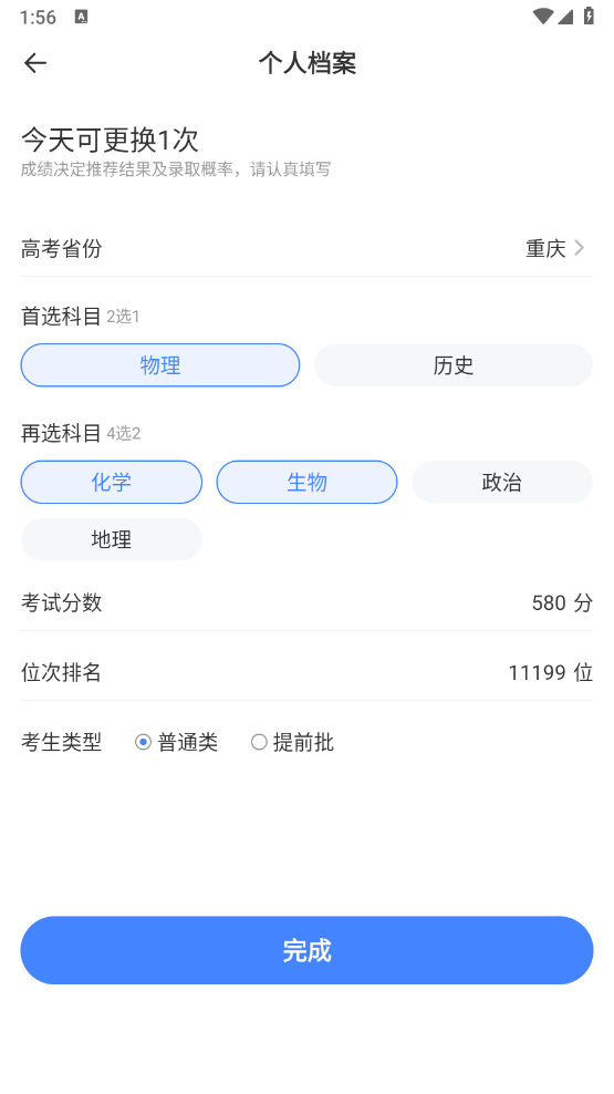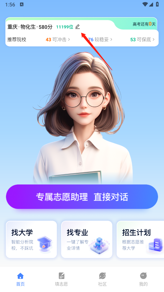 2、进入首页后,点击左上角的编辑按钮,在弹出的页面里,填写高考分数,以及选课方向、类型等相关信息。
