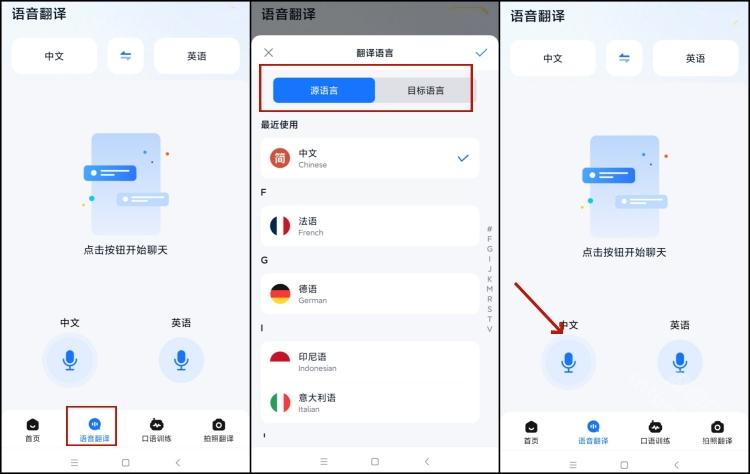 ③选择好语言后,点击“麦克风”,软件会进入实时对话翻译模式。可以直接对着手机说话,软件会实时录制你的声音并翻译成目标语言。