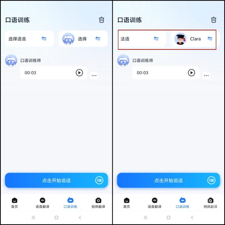 ④除此之外,口语翻译官还支持口语训练,在软件中选择“口语训练”功能,设置训练语言即可实时训练我们的外语口语表达能力啦。