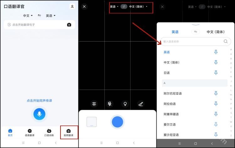 打开安装完成的【口语翻译官】软件。在软件首页,你可以看到多个功能选项。点击“拍照翻译”按钮,进入拍照翻译界面,设置翻译语种。
