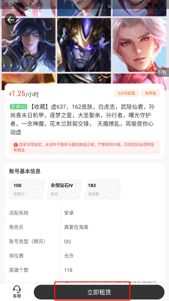 4、选择需要的游戏账号,点击“立即租赁”即可。