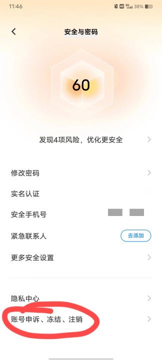 6、返回到安全与密码页面,点击最下面的账号申诉