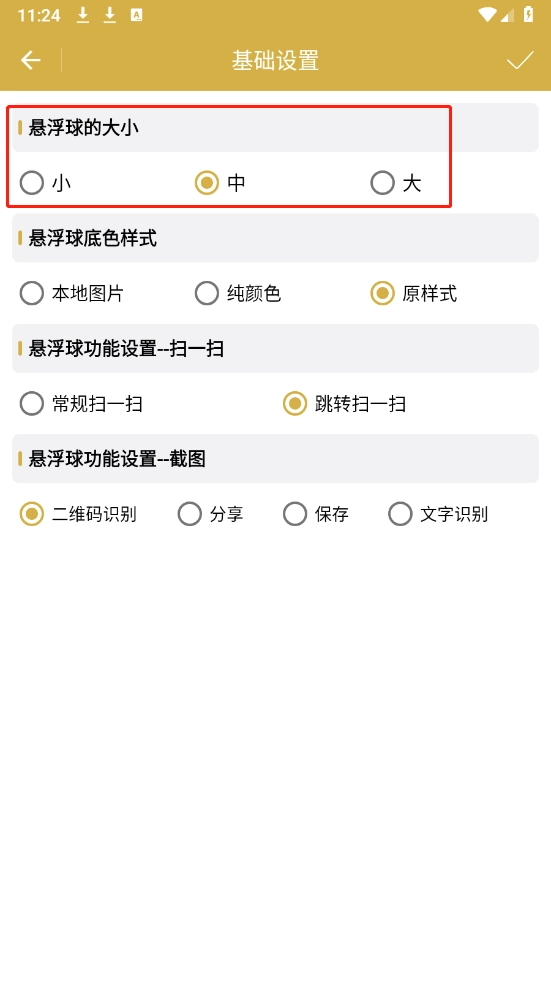 3、在弹出的页面里挑选悬浮球的尺寸,依据自身需求将其设置为小、中或者大就可以了。