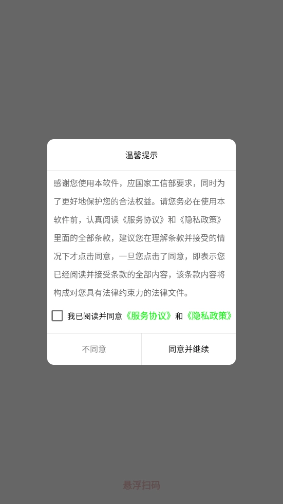 1、安装悬浮扫码软件,在同意相关政策与协议后将其打开。