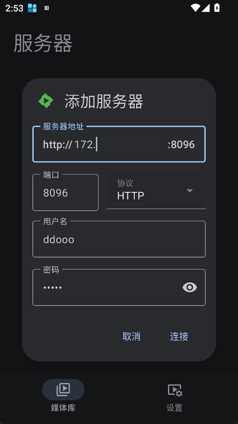 1、打开应用后点击“添加服务器”选项,填写您的Emby服务器地址、对应的端口号以及登录账号信息。