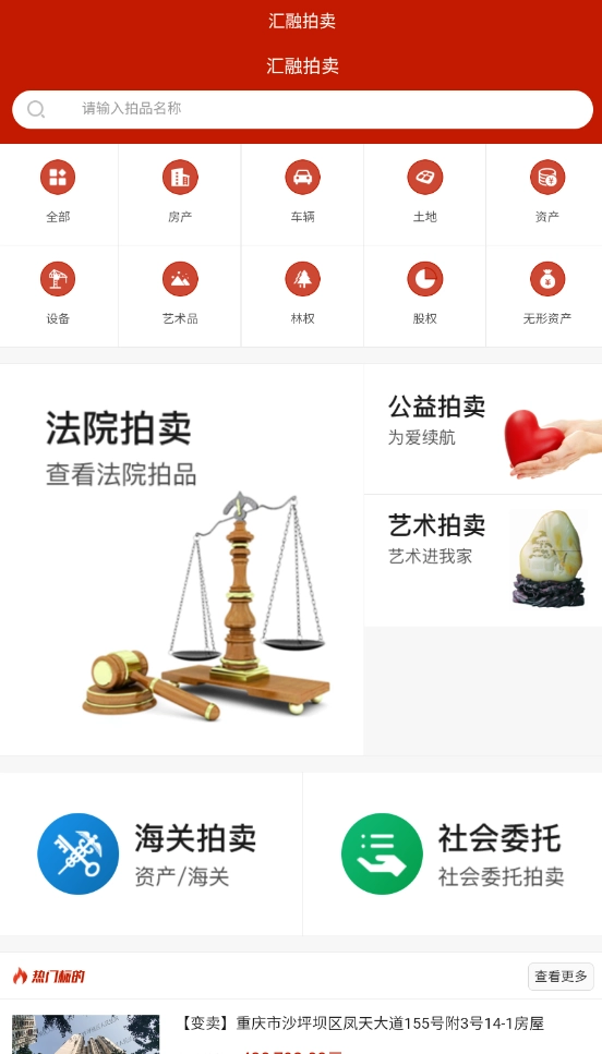 启动汇融拍卖平台后,其首页会呈现司法拍卖、资产处置等各类拍卖类型的入口。