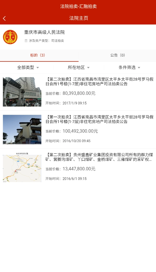 在选择“法院拍卖”功能后,用户能够依据省份和城市来筛选目标区域内的拍卖标的物。