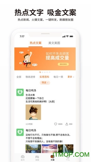 【美文美图】 各类热点资讯、暖心文字、实用百科、美文美图等内容,在朋友圈广泛传播,只需一键转发,就能为设计添彩、为营销助力,让生意经营更轻松。
