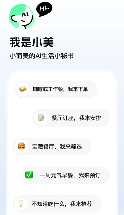 美团小美是一款为大家解决衣食住行烦恼的AI智能生活助手。美团小美AI Agent被广大网友亲切的称呼为"AI生活小秘书",你不需要它的时候它不会主动打扰你,当你需要它的时候全天24小时都能提供服务。小美提供的服务涉及到外卖点单、餐厅预订、电商网购、旅行路线规划以及酒店预订等,满足大家日常生活中的方方面面!