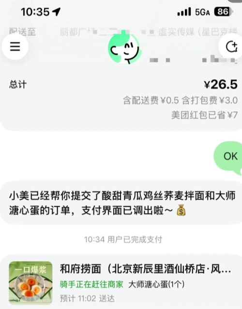 小美会根据你之前的订单记录和地址库信息,自动识别你的偏好和常用地址,从而快速完成点单和配送。