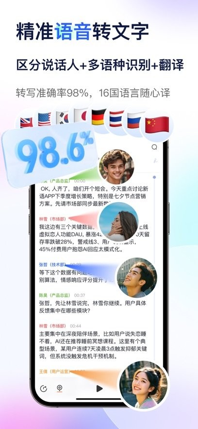 ●职场各类岗位人群(如文秘、产品、运营、策划、销售等):无论是办公会议、商务洽谈,还是电话会议、国际商务谈判等场景,只需一键启动录音功能,就能轻松留存会议内容,还可快速将录音转换成文字版会议纪要,方便及时分享。