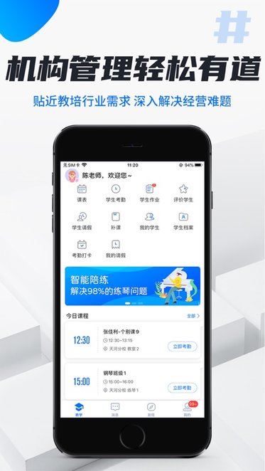 3、学生考勤管理:支持个别课与集体课的快速考勤操作,考勤结果会自动同步至学生端,系统还能自动完成课时统计与提成结算。