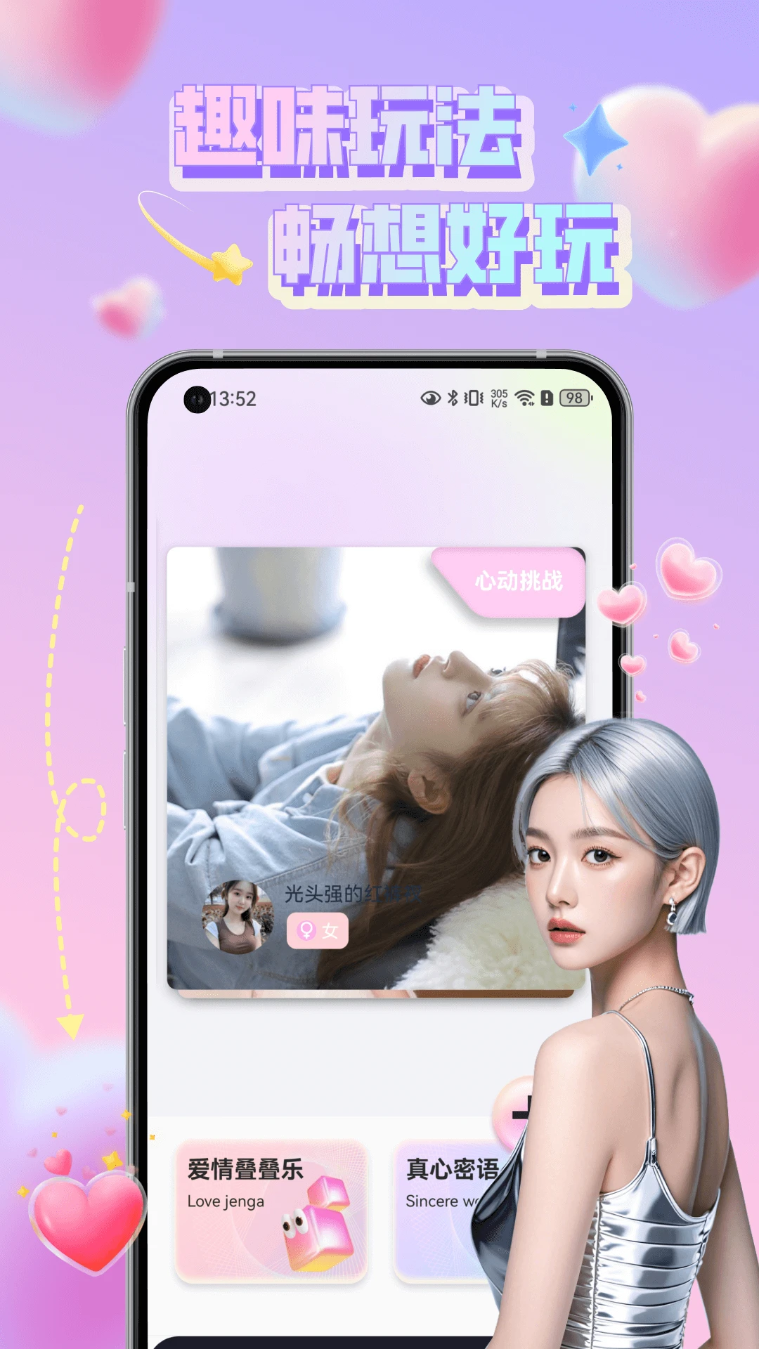 7舍它正确的名字是7社,是一款融入AI技术的全新潮流社交交友软件。打开7舍进入首页会看到爱情叠叠乐和真心密语两个选项,点击即可进入不同的交友玩法。比如7舍手机版的真心密语需要你根据其他用户展示的动态图片填写正确的文案才能解锁浏览,解锁之后就能和该用户开始聊天对话!
