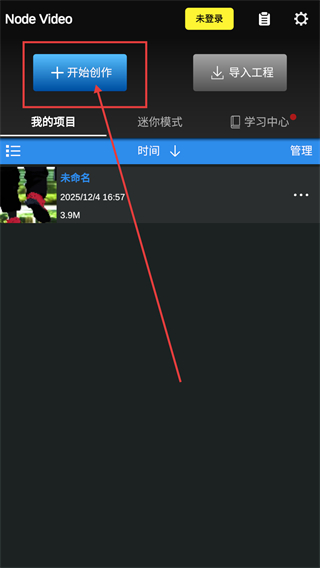 1、在NodeVideo的主页面找到并点击【+开始创作】按钮,即可进入视频编辑的项目界面,开启全新的创作之旅。