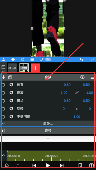 4、导入视频素材后,可在变换面板调整【位置】【缩放】等参数,还能对音频等内容进行设置,从而编辑视频效果。