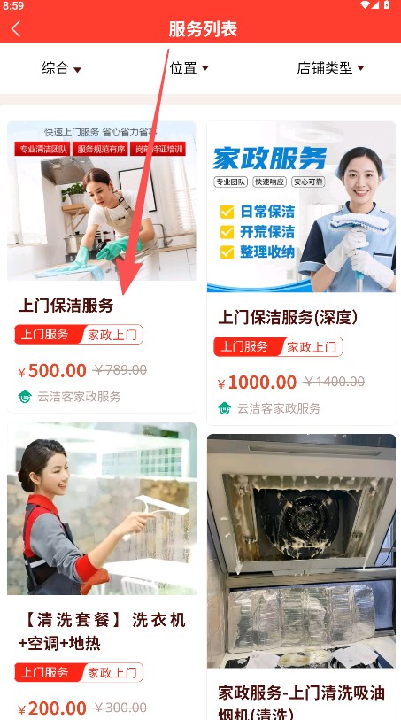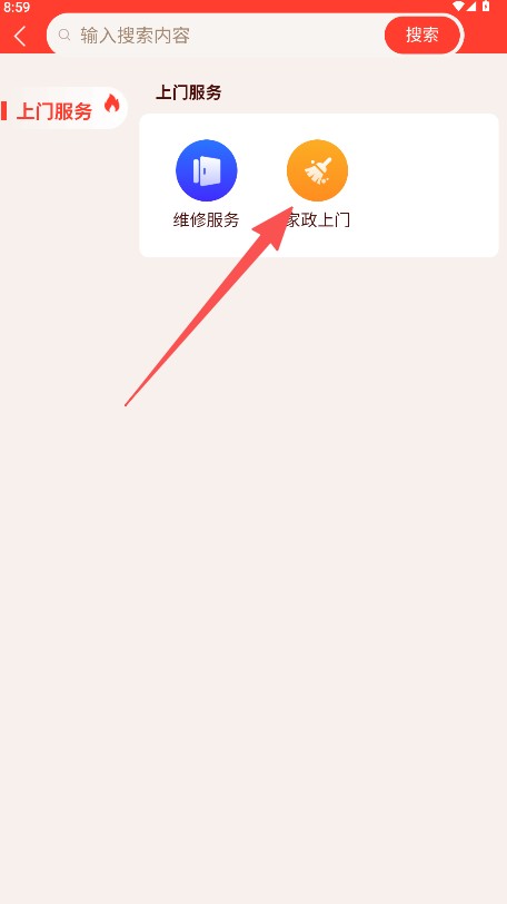 1、在首页上门服务板块找到并点击“家政上门”进入家政服务列表页面。