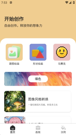 首页设置了跟图绘画、形状绘画、马赛克等功能,并且支持随时填色。